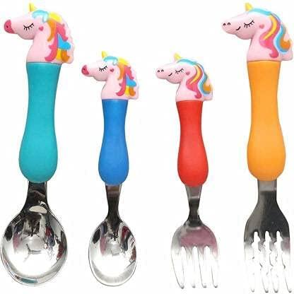 Unicorn Theme Stainless Steel Baby Feeding Spoon and Fork Cutlery Set for Kids Set of 4, Multicolor