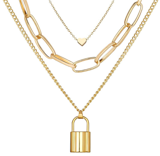 Golden Triple Layered Heart And Lock Pendant Necklace For Women & Girls
